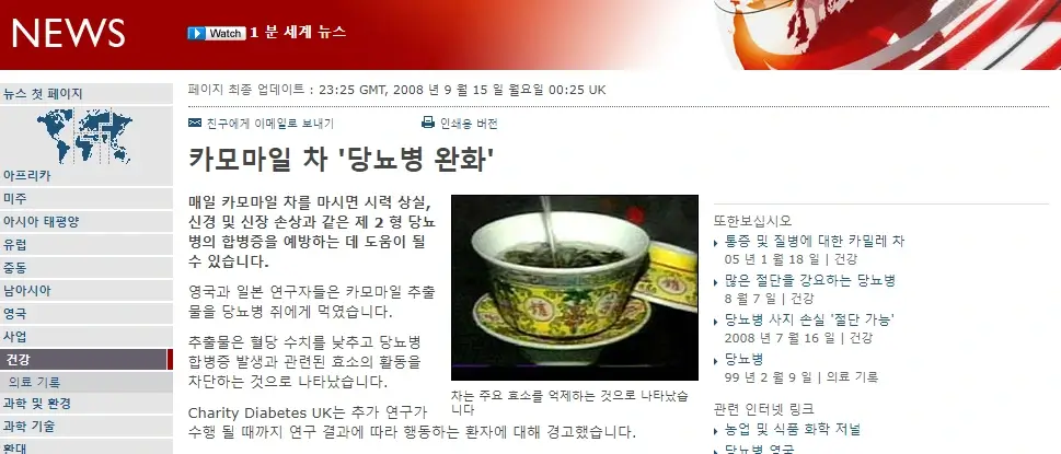 영국 BBC 보도에 따르면 캐모마일은 당뇨 예방에도 효과가 있다고 한다.